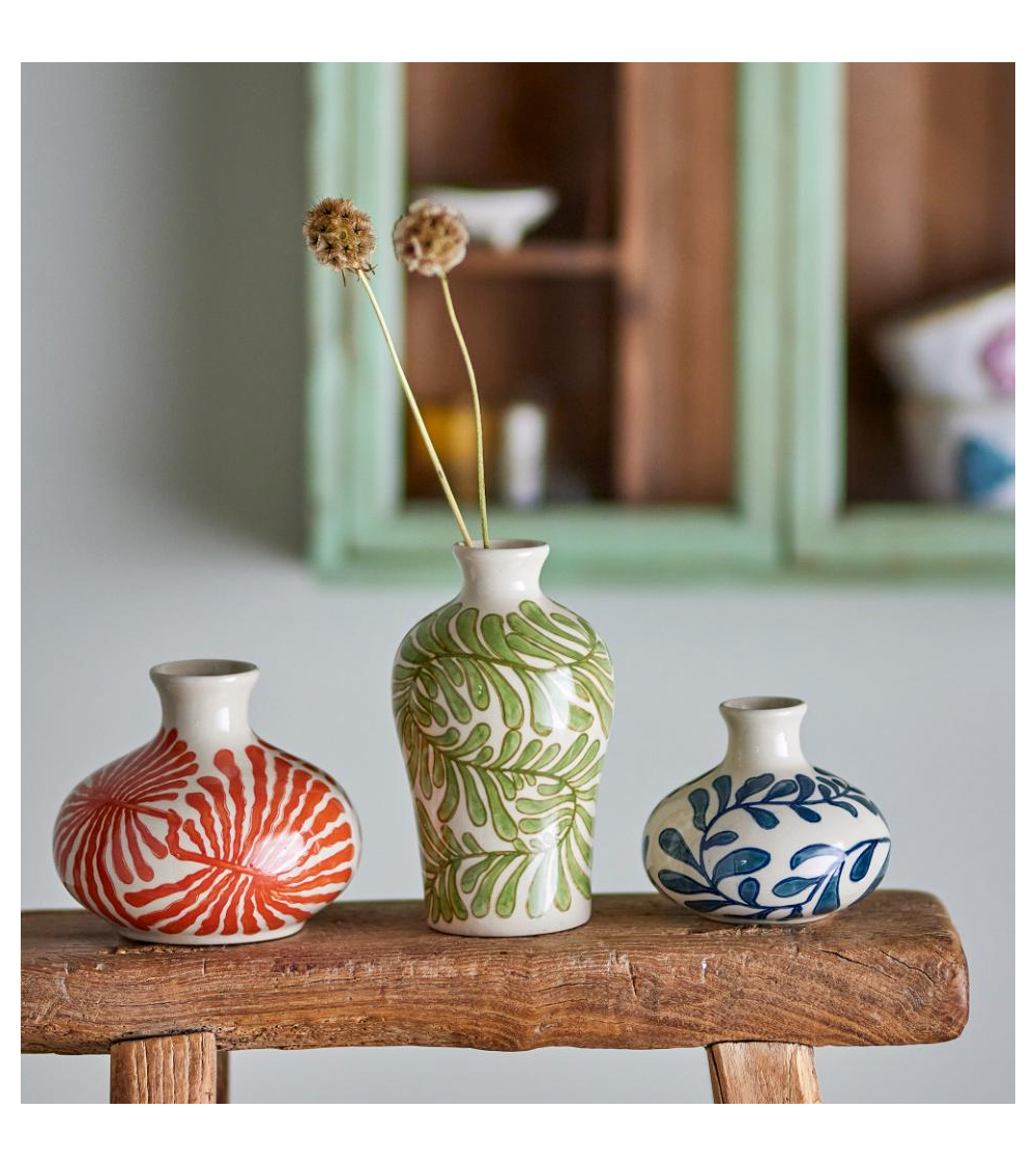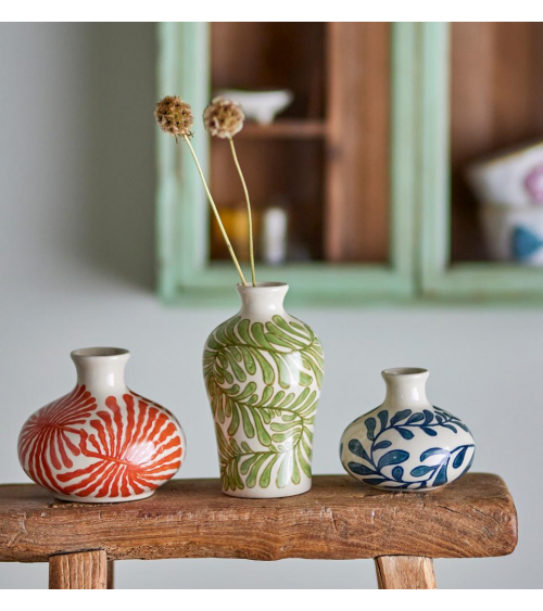 Chaque vase est peint à la main avec des motifs végétaux, chacun dans sa couleur respective : vert, rouge et bleu.