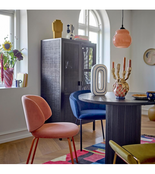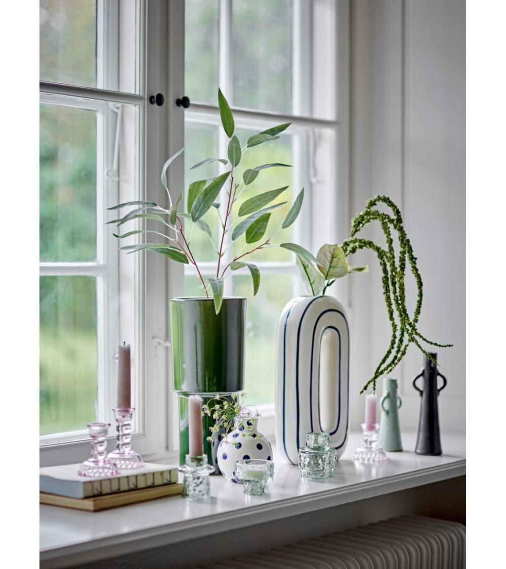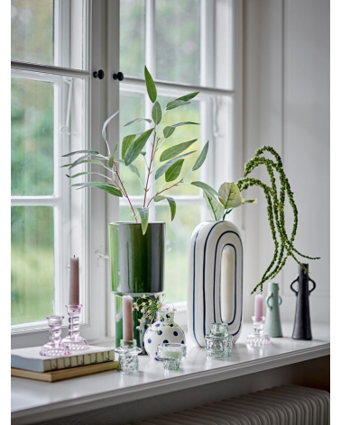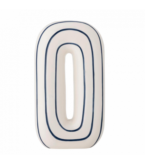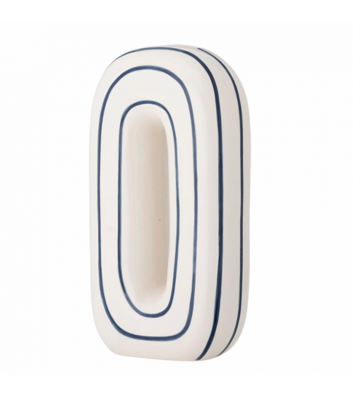 Ce vase est en céramique, avec des rayures bleues peintes à la main.