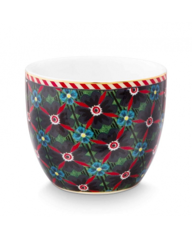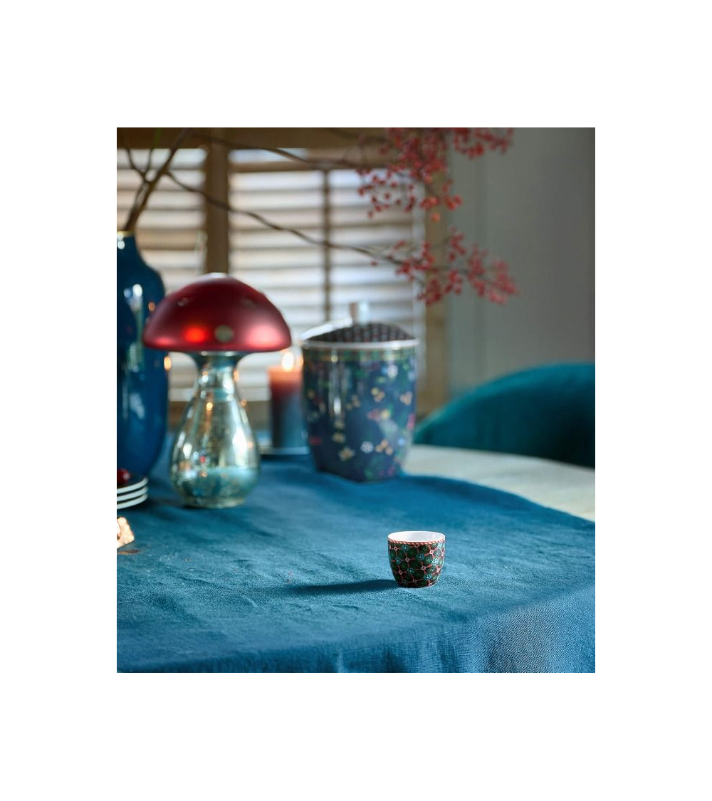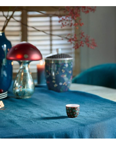 Le coquetier est décoré d'un motif de carreaux vert foncé avec des accents rouges, rappelant les célèbres carreaux d'hiver.