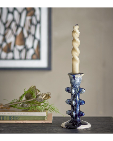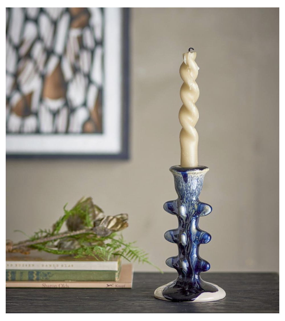 Un bougeoir saisissant et fait main, avec une belle glaçure réactive bleue, qui rend chaque pièce unique avec des variations naturelles de couleur et de forme.