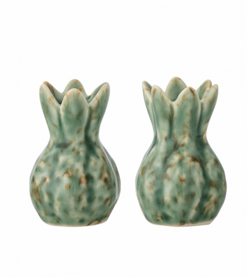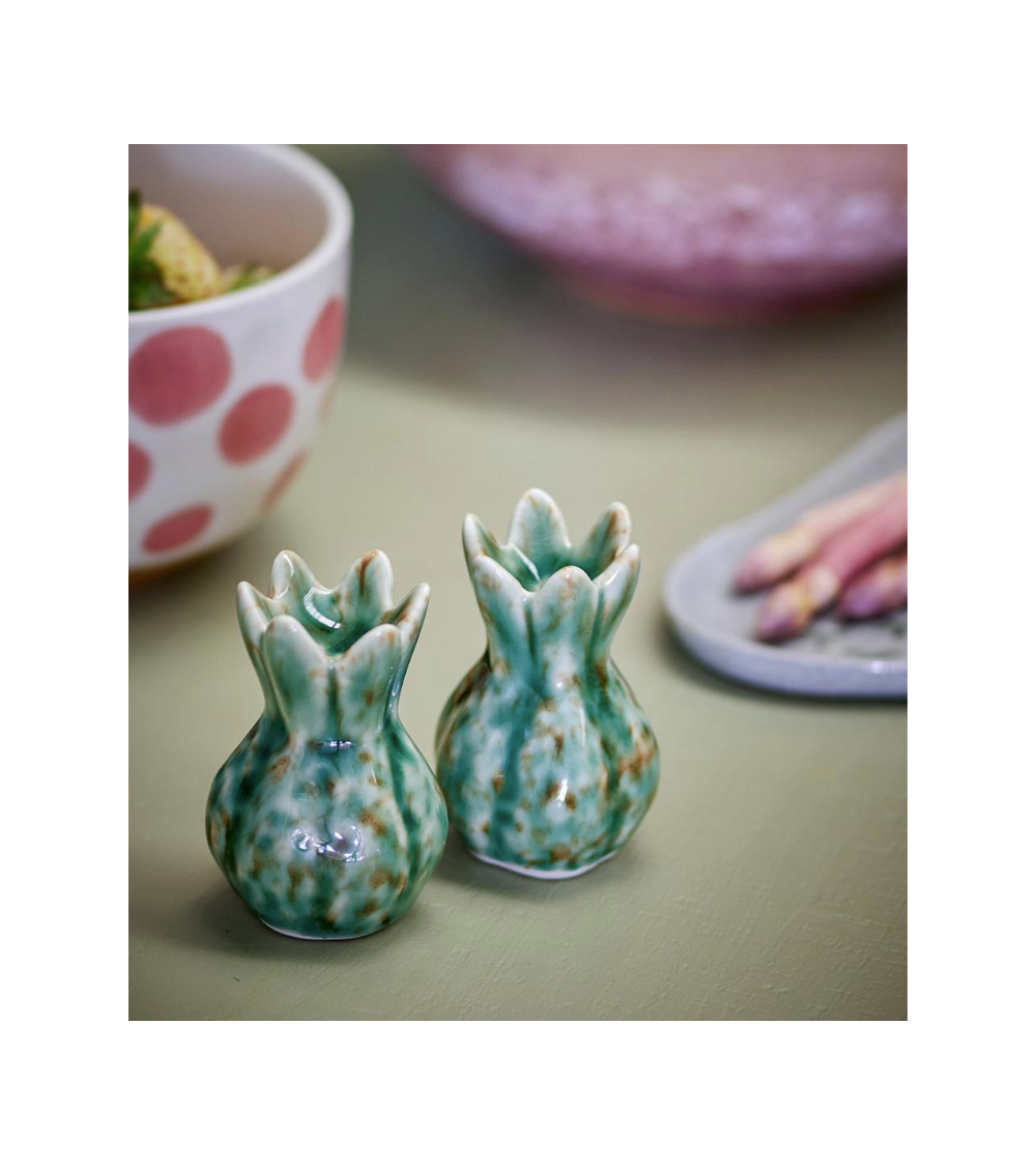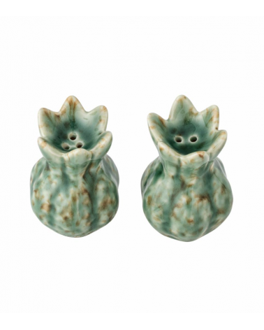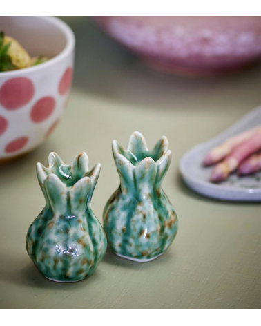 Cet ensemble sel/poivre est fabriqué en grès dans des tons de vert avec une glaçure vibrante. Les formes décoratives donnent du caractère à l'ensemble et en font un complément naturel à la table. La nature de l'émail rend chaque service unique.