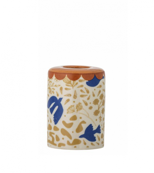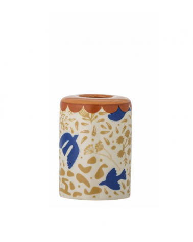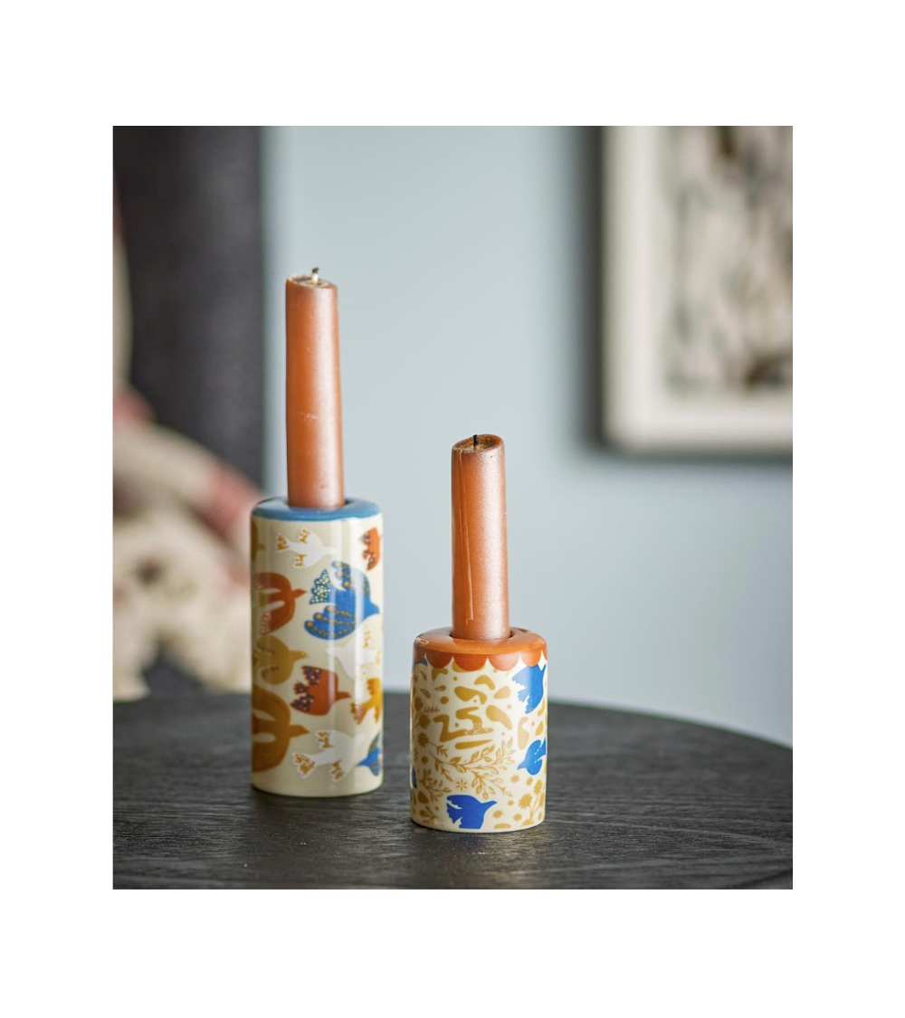 Les Bougeoirs sont fabriqués en grès avec un motif graphique imprimé dans des couleurs chaudes.