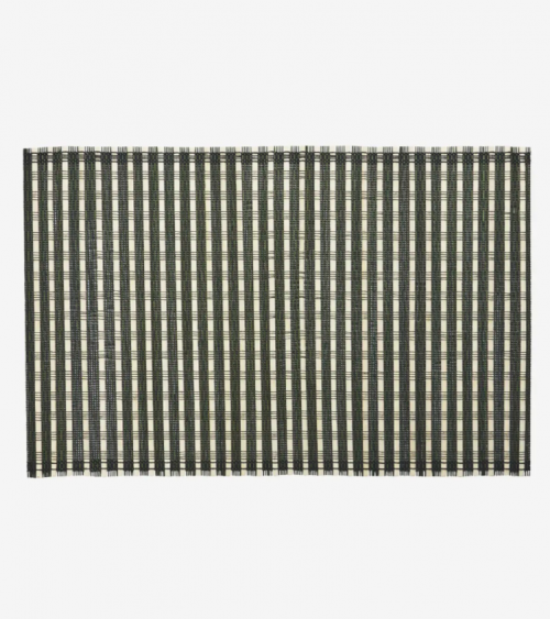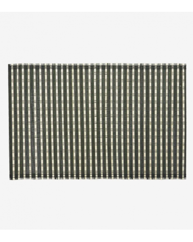 Ce set de table en bambou, fabriqué au Vietnam, combine du bambou et du fil de coton dans des teintes de charbon de bois, naturelles et noires.