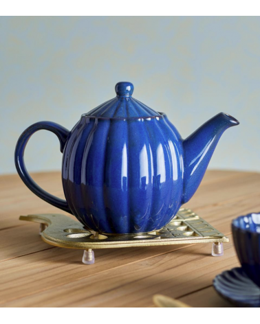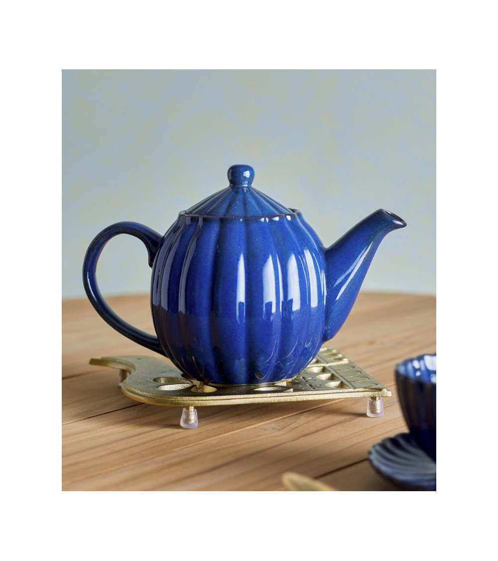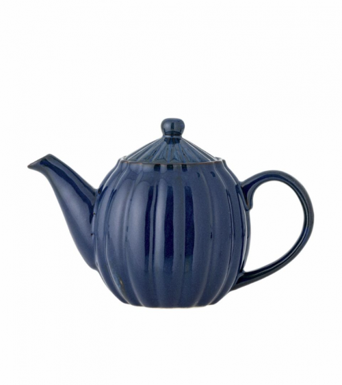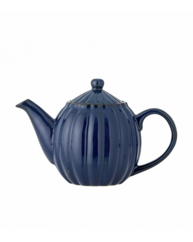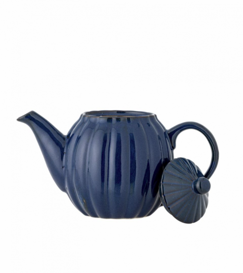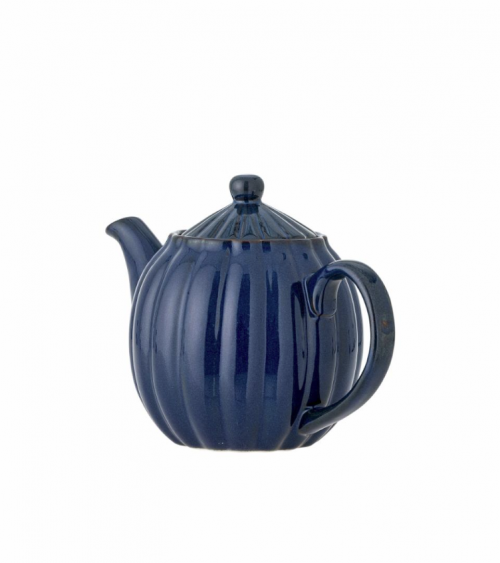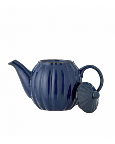 Cette théière est fabriquée en grès et présente une glaçure bleue brillante.