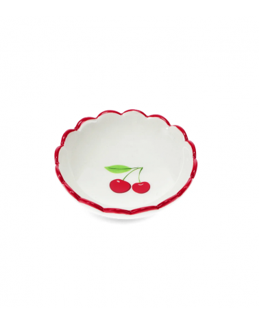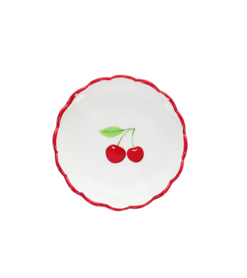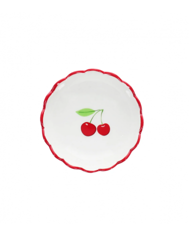 Elle est décorée d'un bord festonné rouge et d'un charmant motif de cerise au centre.