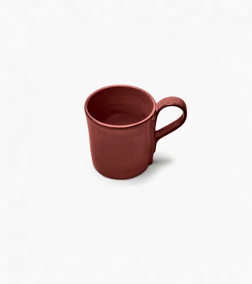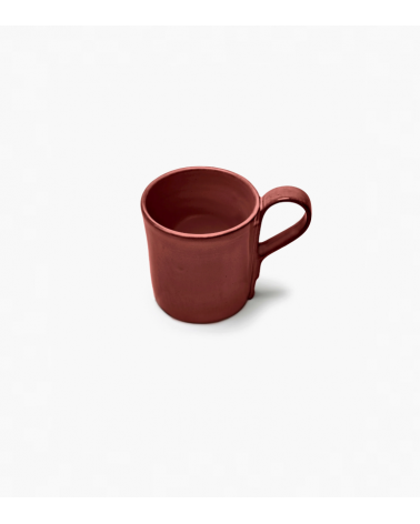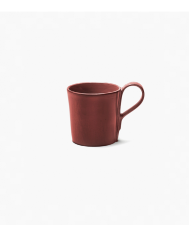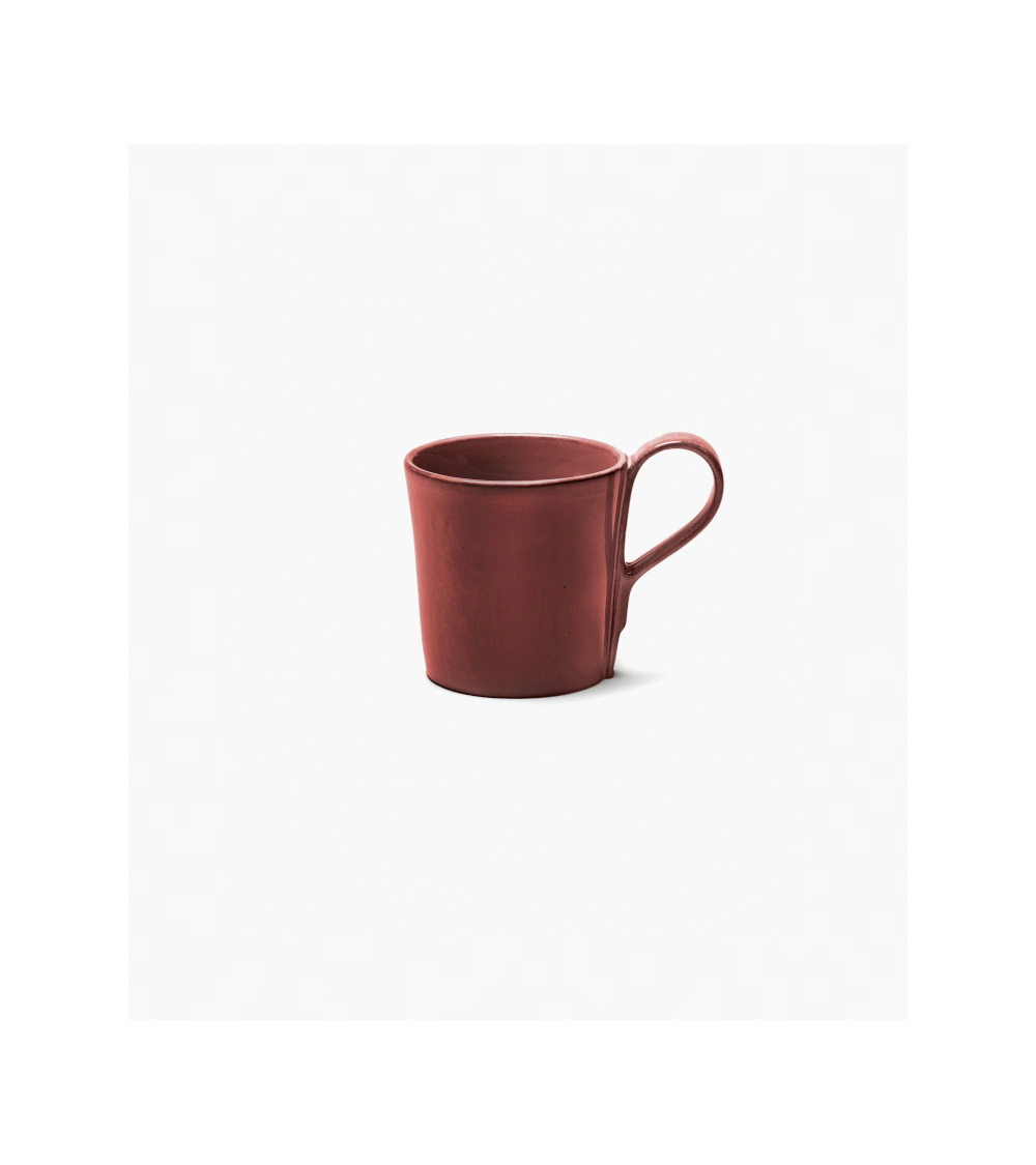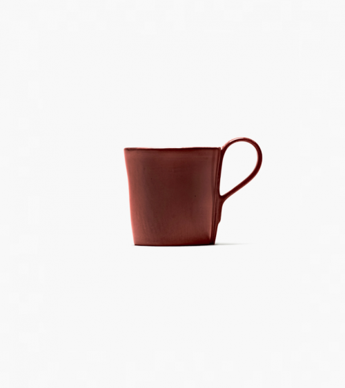 Le grès et les imperfections de cette tasse lui confèrent un look nostalgique, mais son design innovant avec une poignée et une finition en glaçage rouge vénitien lui donnent une sensation contemporaine.