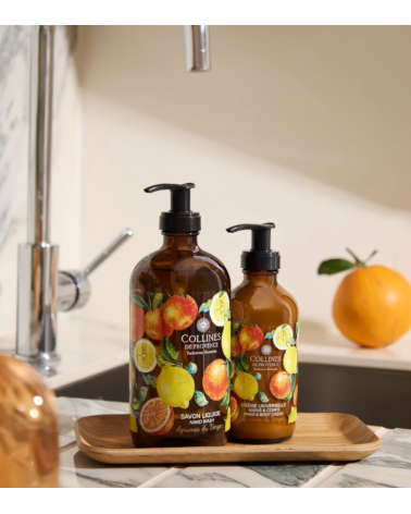 Ce savon liquide Collines de Provence, pour les mains et le corps, nettoie la peau en douceur grâce à sa fabrication selon la méthode traditionnelle unique dite de Marseille.
