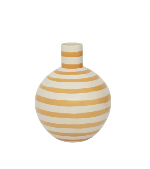 Un charmant vase couleur maïs soufflé avec des rayures horizontales irrégulières orange doré, façonné à partir d’un mélange de céramique recyclée et vierge.