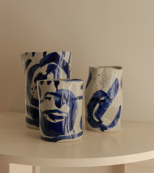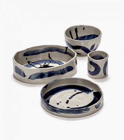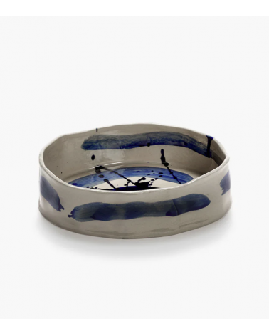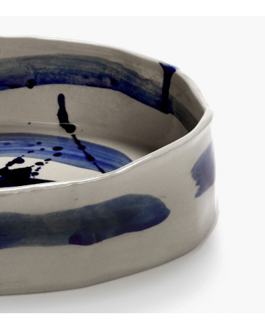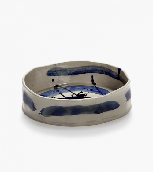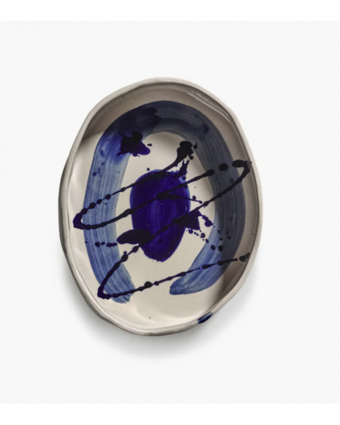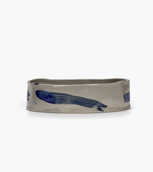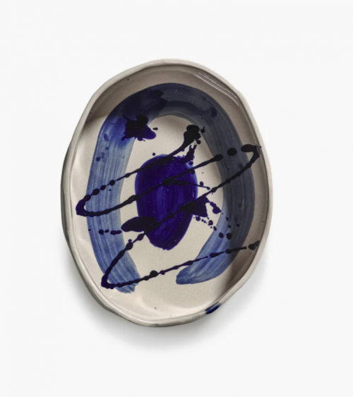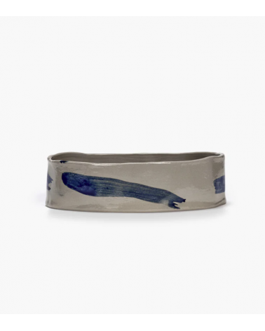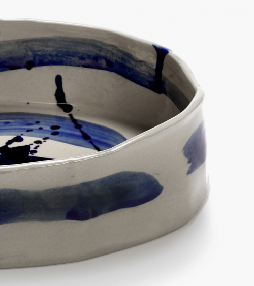 Ce plat ovale profond de la collection Sophia combine une base beige douce avec des coups de pinceau bleus spontanés.