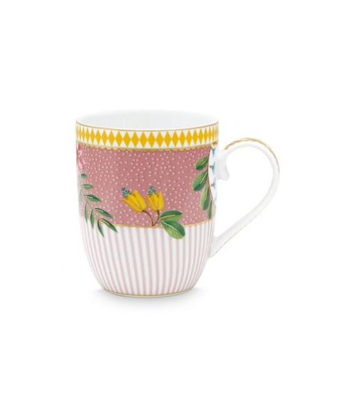 Ce mug en porcelaine est décoré tout autour de fleurs exotiques et de détails dorés.